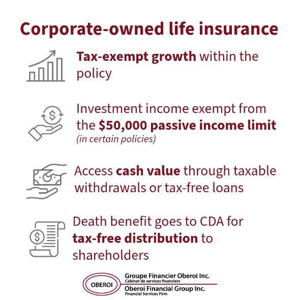 - Investment income in certain policies is exempt from the federal $50,000 passive income limit that could reduce your company’s access to the small business deduction.
